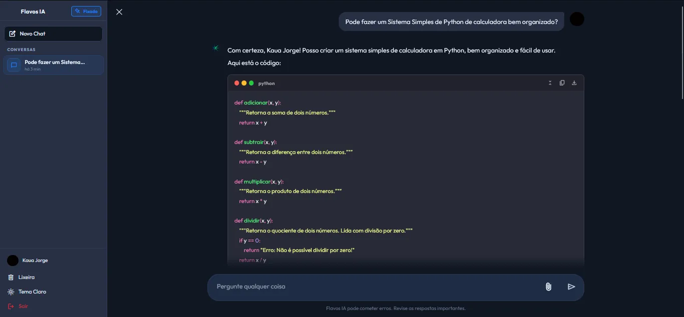 "Um assistente de IA criado para reduzir tarefas repetitivas, organizar ideias e acelerar fluxos de trabalho. Em vez de apenas um chatbot genérico, o Flavos IA foi pensado para fluxos reais: escrever, estudar, programar, revisar e criar com mais velocidade."